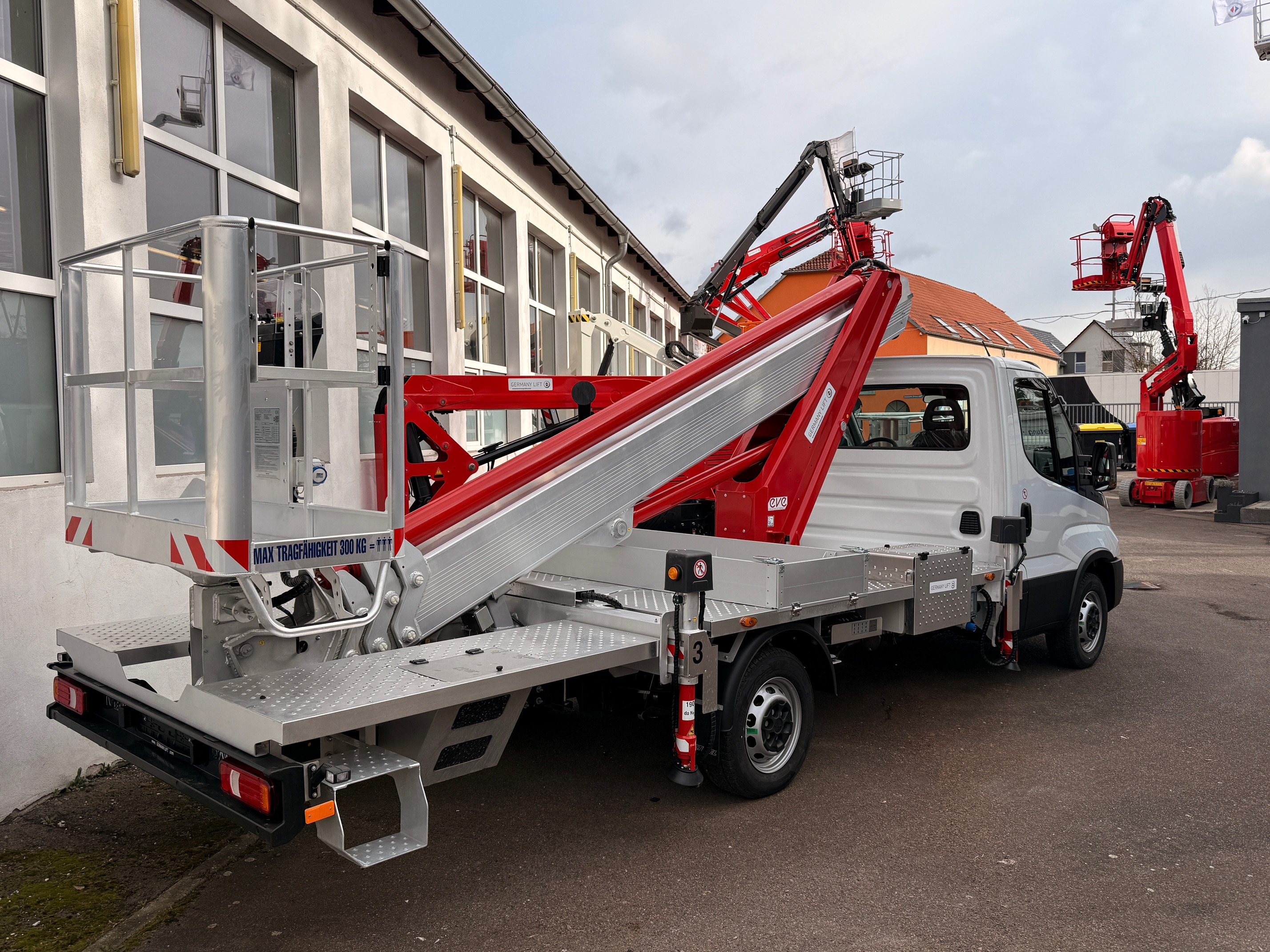 Die Abstützung kann je nach Maschinenausführung im Profil oder als H-Abstützung erfolgen, was die LKW-Hebebühne sehr variabel macht. Die maximale Korblast mit der der Arbeitskorb belastet werden kann liegt hier bei neueren Hubsteigern bei 300 kg wodurch 3 Bediener und Material befördert werden können. Das 3,5 Tonnen-Chassis ist mit seiner Fahrzeugbreite von nur 1,95 Metern äußerst manövrierfähig und kann auch in schmalen Bereichen wie engen Gassen und Innenhöfen zum Einsatz kommen. Da für das Fahren im Straßenbereich nur ein B-Führerschein benötigt wird ist die 16-Meter-LKW-Arbeitsbühne gerade auch für Privatpersonen ohne Probleme zu benutzen.
